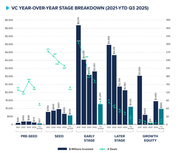 While capital floods the top end of the market, most startups face a far tougher fundraising environment. The data show a clear “flight to quality” by investors toward bigger, later-stage deals. Year-to-date, only ~50% of VC rounds have been under $5 million, down from ~75% in 2015, the lowest share in over a decade. One interpretation may be that the bottom half of the funding funnel (seed and modest Series A rounds) has constricted meaningfully; however, another interpretation may be that on an inflation-adjusted basis, sub-$1M and sub-$5M rounds are no longer sufficient at the earliest stages to build venture-scalable businesses. Alternatively, the decline of sub-$5M rounds may underscore the quality disparity and how selective venture funding has become – micro-startups are struggling to find backers, while investors pile into larger, “surefire” bets. Founders themselves are adjusting to this reality: able founders are raising larger rounds than they normally would, to extend runway and delay the next fundraise until conditions (hopefully) improve. This dynamic was evident in stage data: Series C and later rounds soaked up an outsized portion of capital, while seed activity flatlined. In Q2, later-stage VC (Series C+) totaled $55B (+53% YoY), whereas early-stage (Series A/B) was ~$26B (flat) and seed deal value was ~$10B (roughly flat, once a one-off $2B AI seed mega-deal is excluded). Q3 appears to have followed a similar pattern, only amplified by the mega-deal mania. The result is a barbell market: a glut of capital for a few winners, and a capital crunch for everyone else.